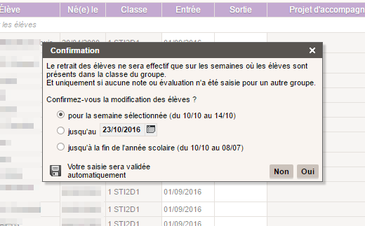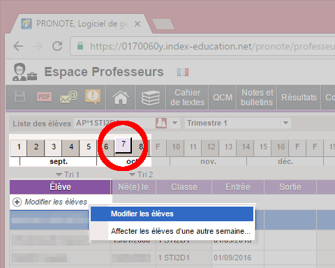 Vous pouvez sélectionner plusieurs semaines consécutives en faisant glisser la souris sur les semaines qui suivent. - Cliquer sur le champ “Modifier les élèves” (en haut de la liste), un sous-menu apparaît, puis cliquer sur la commande “Modifier les élèves”
