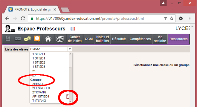 - Depuis ProNote Web en mode Enseignant, appeler le menu Ressources | Classes/Groupes | Listes des élèves