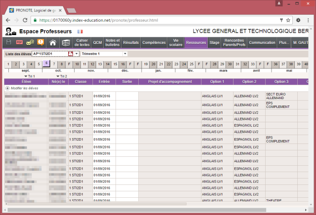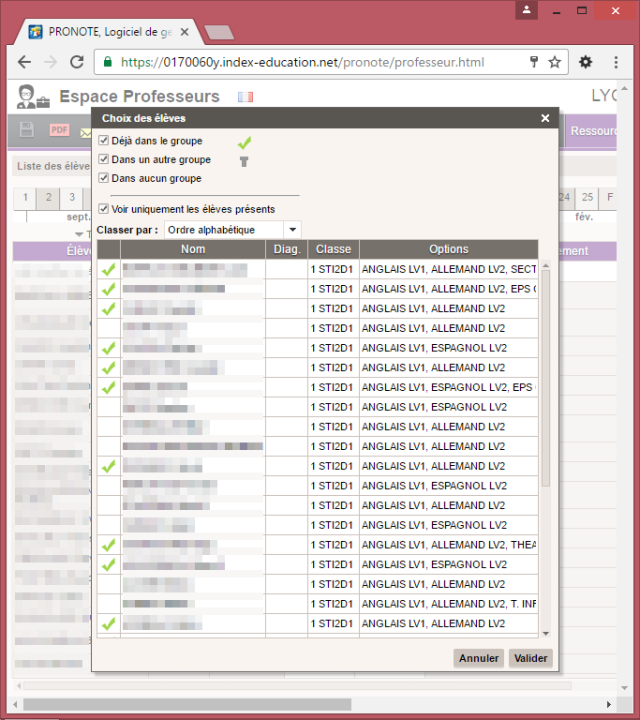Même si vous avez une classe entière en AP, c’est bien dans la section “Groupes” à la fin de la liste déroulante, que l’on trouve une classe entière gérée en AP !La liste d’élèves apparaît, avec le bandeau des semaines au-dessus.