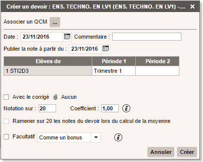 Le lancement du questionnaire est effectué par la création d’un devoir dans la rubrique “Notes et bulletins”.