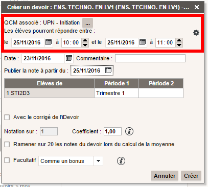 Le nom du QCM apparaît, ainsi que la sélection du début et de la fin de la période autorisée (dates et heures) pour effectuer l’évaluation. - Saisir les dates et heures de début et de fin,