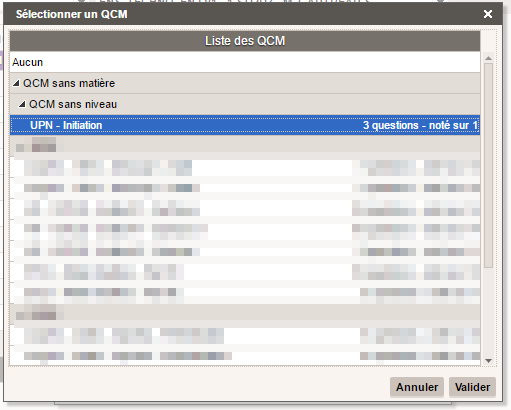 La boite de dialogue est complétée par la liste des QCM disponibles.