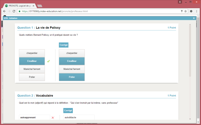 Ensuite le corrigé apparaît (selon le choix du professeur).