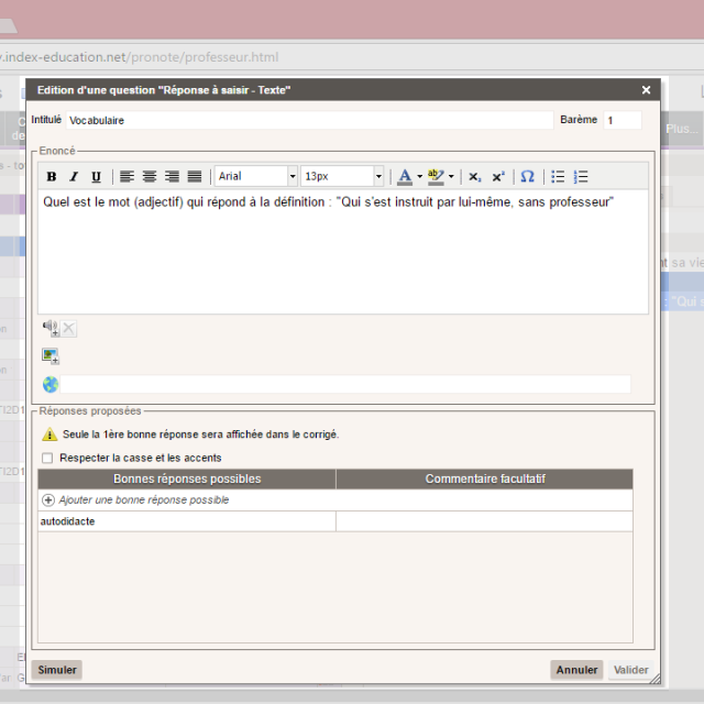 - Pour donner plus de souplesse aux réponses possibles (en général), décocher la case juste au-dessus “Respecter la casse et les accents” afin de ne pas tenir compte des minuscules/majuscules et des accents
