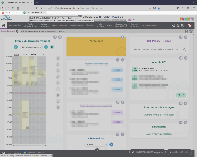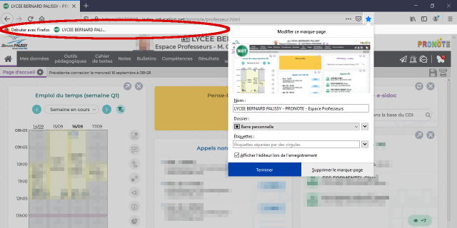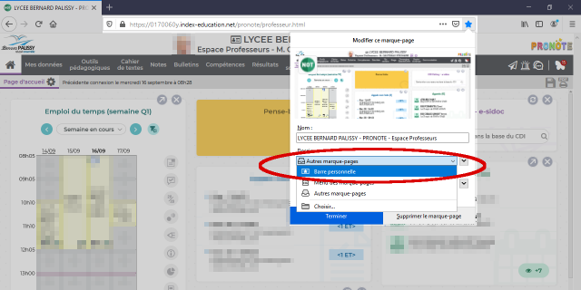 C’est fait. Vous pouvez désormais accéder directement à Pronote Professeur depuis la barre personnelle (marque-pages) de votre navigateur Web Firefox.