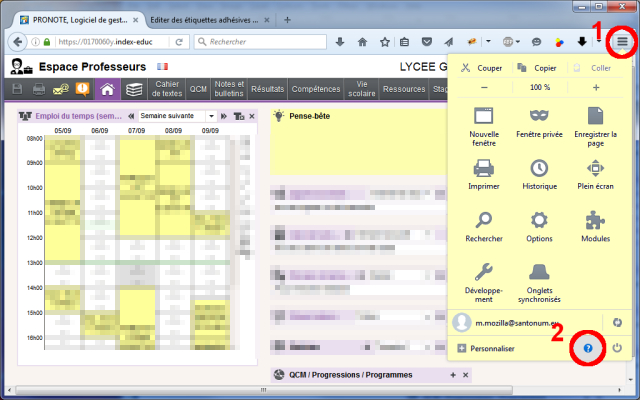 - (1) : Ouvrir le menu général de Firefox par le bouton “à 3 lignes” tout à droite de la barre d’adresse.